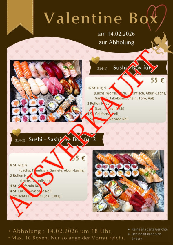Die Bestellungen für die Valentins-Box sind aufgrund der erreichten geplanten Stückzahl beendet, die Box ist ausverkauft. Vielen Dank für Ihre vielen Bestellungen!